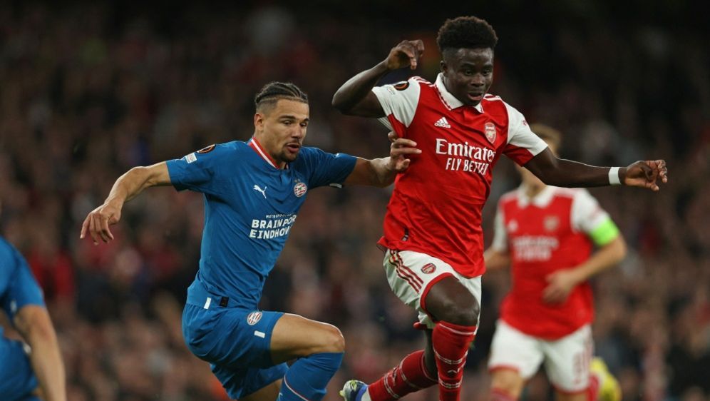 Für die Gunners aus London geht es am Donnerstag 20. FC Arsenal gegen PSV Eindhoven ab 19 Uhr LIVE. Bukayo Saka of Arsenal passes the ball whilst under pressure from Erick Gutierrez and Philipp Max of PSV Eindhoven during the UEFA Europa.